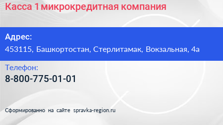 Касса №1, микрокредитная компания по адресу 453115, Башкортостан, Стерлитамак, Вокзальная, 4а в дальнейшем Организация, размещена в следующих категориях: