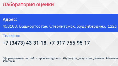 Лаборатория оценки по адресу 453103, Башкортостан, Стерлитамак, Худайбердина, 122а в дальнейшем Организация, размещена в следующих категориях: