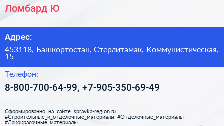 Ломбард-Ю по адресу 453118, Башкортостан, Стерлитамак, Коммунистическая, 15 в дальнейшем Организация, размещена в следующих категориях: