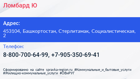 Ломбард-Ю по адресу 453104, Башкортостан, Стерлитамак, Социалистическая, 2 в дальнейшем Организация, размещена в следующих категориях: