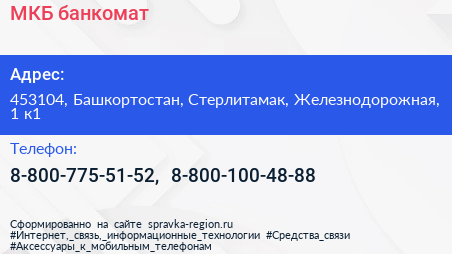 МКБ, банкомат по адресу 453104, Башкортостан, Стерлитамак, Железнодорожная, 1 к1 в дальнейшем Организация, размещена в следующих категориях: