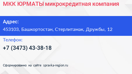 МКК ЮРМАТЫ, микрокредитная компания по адресу 453103, Башкортостан, Стерлитамак, Дружбы, 12 в дальнейшем Организация, размещена в следующих категориях: