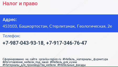 Налог и право по адресу 453103, Башкортостан, Стерлитамак, Геологическая, 2е в дальнейшем Организация, размещена в следующих категориях: