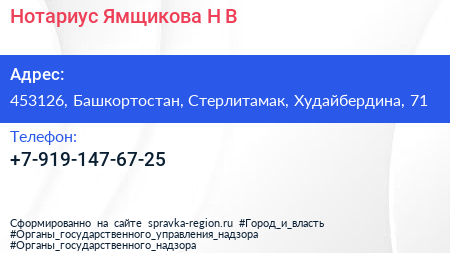 Нотариус Ямщикова Н.В. по адресу 453126, Башкортостан, Стерлитамак, Худайбердина, 71 в дальнейшем Организация, размещена в следующих категориях: