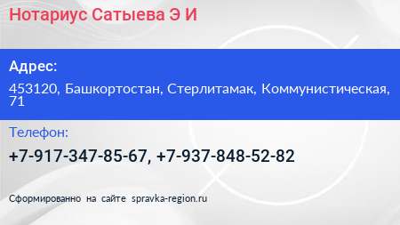 Нотариус Сатыева Э.И. по адресу 453120, Башкортостан, Стерлитамак, Коммунистическая, 71 в дальнейшем Организация, размещена в следующих категориях: