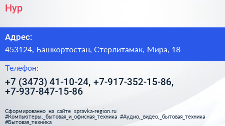 Нур по адресу 453124, Башкортостан, Стерлитамак, Мира, 18 в дальнейшем Организация, размещена в следующих категориях: