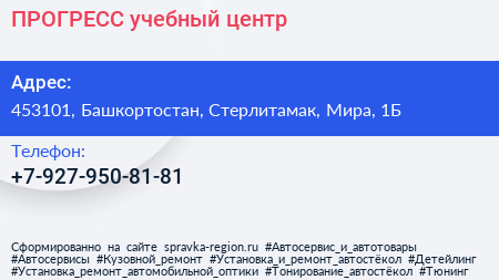 ПРОГРЕСС, учебный центр по адресу 453101, Башкортостан, Стерлитамак, Мира, 1Б в дальнейшем Организация, размещена в следующих категориях: