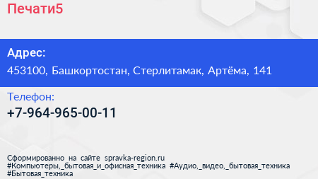 Печати5 по адресу 453100, Башкортостан, Стерлитамак, Артёма, 141 в дальнейшем Организация, размещена в следующих категориях: