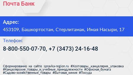 Почта Банк по адресу 453109, Башкортостан, Стерлитамак, Имая Насыри, 17 в дальнейшем Организация, размещена в следующих категориях: