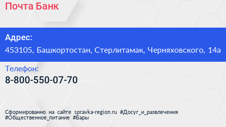 Почта Банк по адресу 453105, Башкортостан, Стерлитамак, Черняховского, 14а в дальнейшем Организация, размещена в следующих категориях:
