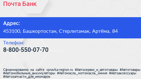 Почта Банк по адресу 453100, Башкортостан, Стерлитамак, Артёма, 84 в дальнейшем Организация, размещена в следующих категориях: