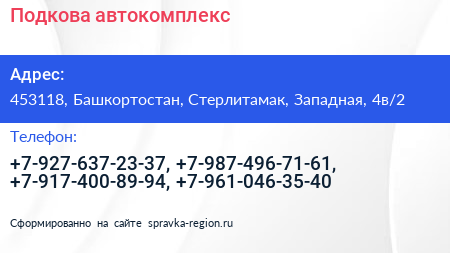 Подкова, автокомплекс по адресу 453118, Башкортостан, Стерлитамак, Западная, 4в/2 в дальнейшем Организация, размещена в следующих категориях: