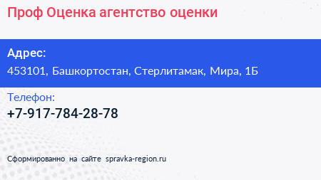 Проф-Оценка, агентство оценки по адресу 453101, Башкортостан, Стерлитамак, Мира, 1Б в дальнейшем Организация, размещена в следующих категориях: