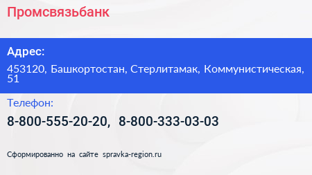Промсвязьбанк по адресу 453120, Башкортостан, Стерлитамак, Коммунистическая, 51 в дальнейшем Организация, размещена в следующих категориях: