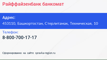 Райффайзенбанк, банкомат по адресу 453110, Башкортостан, Стерлитамак, Техническая, 10 в дальнейшем Организация, размещена в следующих категориях: