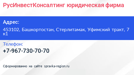 РусИнвестКонсалтинг, юридическая фирма по адресу 453102, Башкортостан, Стерлитамак, Уфимский тракт, 7 к1 в дальнейшем Организация, размещена в следующих категориях:
