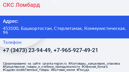 СКС Ломбард по адресу 453100, Башкортостан, Стерлитамак, Коммунистическая, 96 в дальнейшем Организация, размещена в следующих категориях: