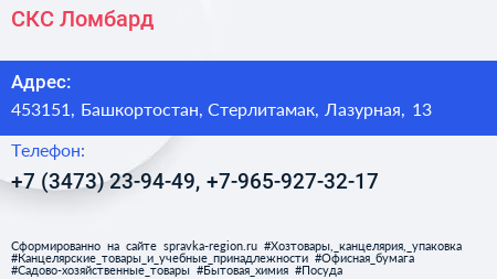 СКС Ломбард по адресу 453151, Башкортостан, Стерлитамак, Лазурная, 13 в дальнейшем Организация, размещена в следующих категориях: