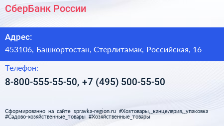 СберБанк России по адресу 453106, Башкортостан, Стерлитамак, Российская, 16 в дальнейшем Организация, размещена в следующих категориях:
