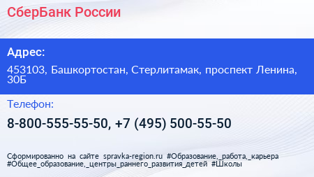 СберБанк России по адресу 453103, Башкортостан, Стерлитамак, проспект Ленина, 30Б в дальнейшем Организация, размещена в следующих категориях: