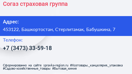 Согаз, страховая группа по адресу 453122, Башкортостан, Стерлитамак, Бабушкина, 7 в дальнейшем Организация, размещена в следующих категориях: