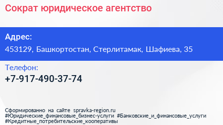 Сократ, юридическое агентство по адресу 453129, Башкортостан, Стерлитамак, Шафиева, 35 в дальнейшем Организация, размещена в следующих категориях: