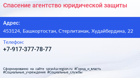 Спасение, агентство юридической защиты по адресу 453124, Башкортостан, Стерлитамак, Худайбердина, 22 в дальнейшем Организация, размещена в следующих категориях: