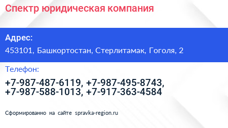 Спектр, юридическая компания по адресу 453101, Башкортостан, Стерлитамак, Гоголя, 2 в дальнейшем Организация, размещена в следующих категориях: