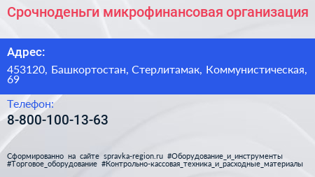 Срочноденьги, микрофинансовая организация по адресу 453120, Башкортостан, Стерлитамак, Коммунистическая, 69 в дальнейшем Организация, размещена в следующих категориях: