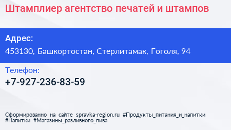 Штамплиер, агентство печатей и штампов по адресу 453130, Башкортостан, Стерлитамак, Гоголя, 94 в дальнейшем Организация, размещена в следующих категориях: