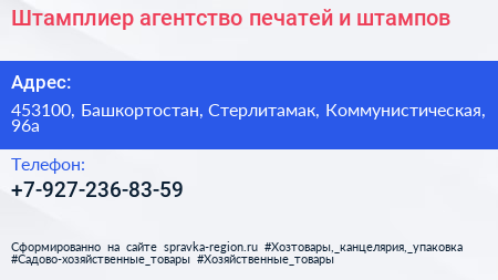 Штамплиер, агентство печатей и штампов по адресу 453100, Башкортостан, Стерлитамак, Коммунистическая, 96а в дальнейшем Организация, размещена в следующих категориях: