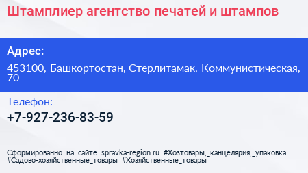 Штамплиер, агентство печатей и штампов по адресу 453100, Башкортостан, Стерлитамак, Коммунистическая, 70 в дальнейшем Организация, размещена в следующих категориях: