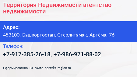 Территория Недвижимости, агентство недвижимости по адресу 453100, Башкортостан, Стерлитамак, Артёма, 76 в дальнейшем Организация, размещена в следующих категориях: