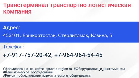 Транстерминал, транспортно-логистическая компания по адресу 453101, Башкортостан, Стерлитамак, Казина, 5 в дальнейшем Организация, размещена в следующих категориях:
