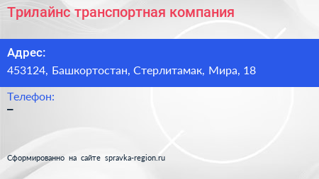 Трилайнс, транспортная компания по адресу 453124, Башкортостан, Стерлитамак, Мира, 18 в дальнейшем Организация, размещена в следующих категориях: