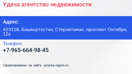 Удача, агентство недвижимости по адресу 453118, Башкортостан, Стерлитамак, проспект Октября, 12а в дальнейшем Организация, размещена в следующих категориях: