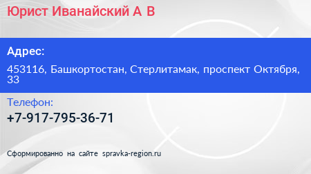 Юрист Иванайский А.В. по адресу 453116, Башкортостан, Стерлитамак, проспект Октября, 33 в дальнейшем Организация, размещена в следующих категориях: