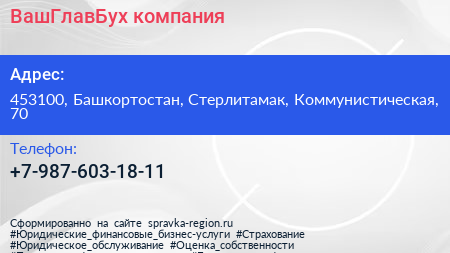 ВашГлавБух, компания по адресу 453100, Башкортостан, Стерлитамак, Коммунистическая, 70 в дальнейшем Организация, размещена в следующих категориях: