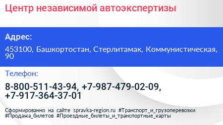 Центр независимой автоэкспертизы по адресу 453100, Башкортостан, Стерлитамак, Коммунистическая, 90 в дальнейшем Организация, размещена в следующих категориях: