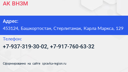 АК ВНЗМ по адресу 453124, Башкортостан, Стерлитамак, Карла Маркса, 129 в дальнейшем Организация, размещена в следующих категориях: