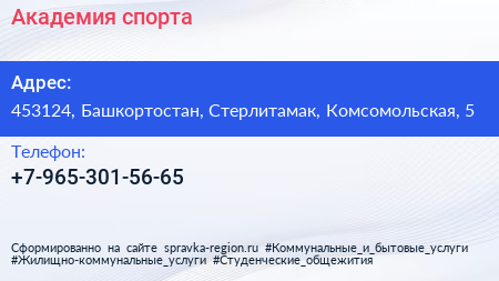 Академия спорта по адресу 453124, Башкортостан, Стерлитамак, Комсомольская, 5 в дальнейшем Организация, размещена в следующих категориях: