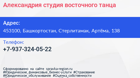 Александрия, студия восточного танца по адресу 453100, Башкортостан, Стерлитамак, Артёма, 138 в дальнейшем Организация, размещена в следующих категориях: