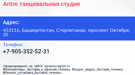 Antre, танцевальная студия по адресу 453116, Башкортостан, Стерлитамак, проспект Октября, 35 в дальнейшем Организация, размещена в следующих категориях: