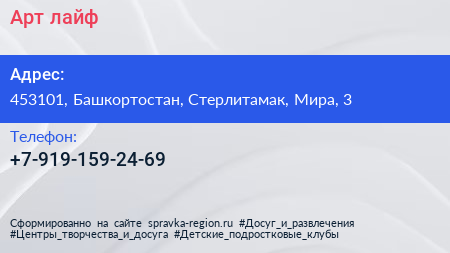 Арт лайф по адресу 453101, Башкортостан, Стерлитамак, Мира, 3 в дальнейшем Организация, размещена в следующих категориях:
