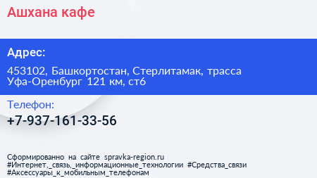 Ашхана, кафе по адресу 453102, Башкортостан, Стерлитамак, трасса Уфа-Оренбург 121 км, ст6 в дальнейшем Организация, размещена в следующих категориях: