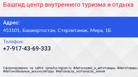 Башгид, центр внутреннего туризма и отдыха по адресу 453101, Башкортостан, Стерлитамак, Мира, 1Б в дальнейшем Организация, размещена в следующих категориях: