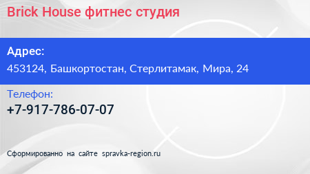 Brick House, фитнес-студия по адресу 453124, Башкортостан, Стерлитамак, Мира, 24 в дальнейшем Организация, размещена в следующих категориях: