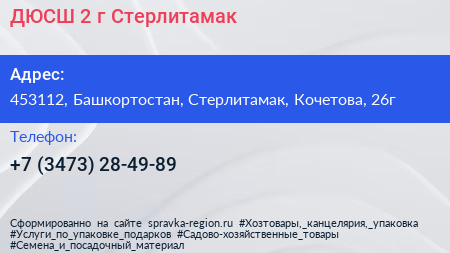 ДЮСШ №2, г. Стерлитамак по адресу 453112, Башкортостан, Стерлитамак, Кочетова, 26г в дальнейшем Организация, размещена в следующих категориях: