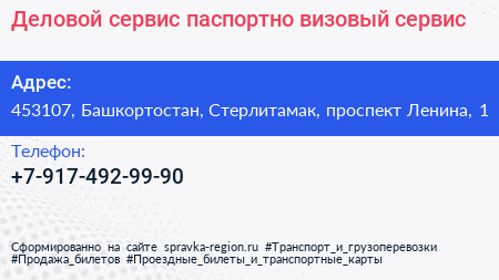 Деловой сервис, паспортно-визовый сервис по адресу 453107, Башкортостан, Стерлитамак, проспект Ленина, 1 в дальнейшем Организация, размещена в следующих категориях: