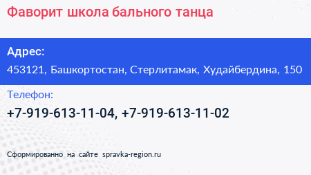 Фаворит, школа бального танца по адресу 453121, Башкортостан, Стерлитамак, Худайбердина, 150 в дальнейшем Организация, размещена в следующих категориях: